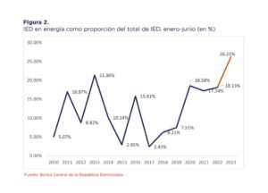 Según el informe del Banco Central el porcentaje que representa la IED en energía con respecto al flujo total recibido en el primer semestre de 2023 fue de 26.21%, éste es el porcentaje más alto en un primer semestre recibido desde el 2010.