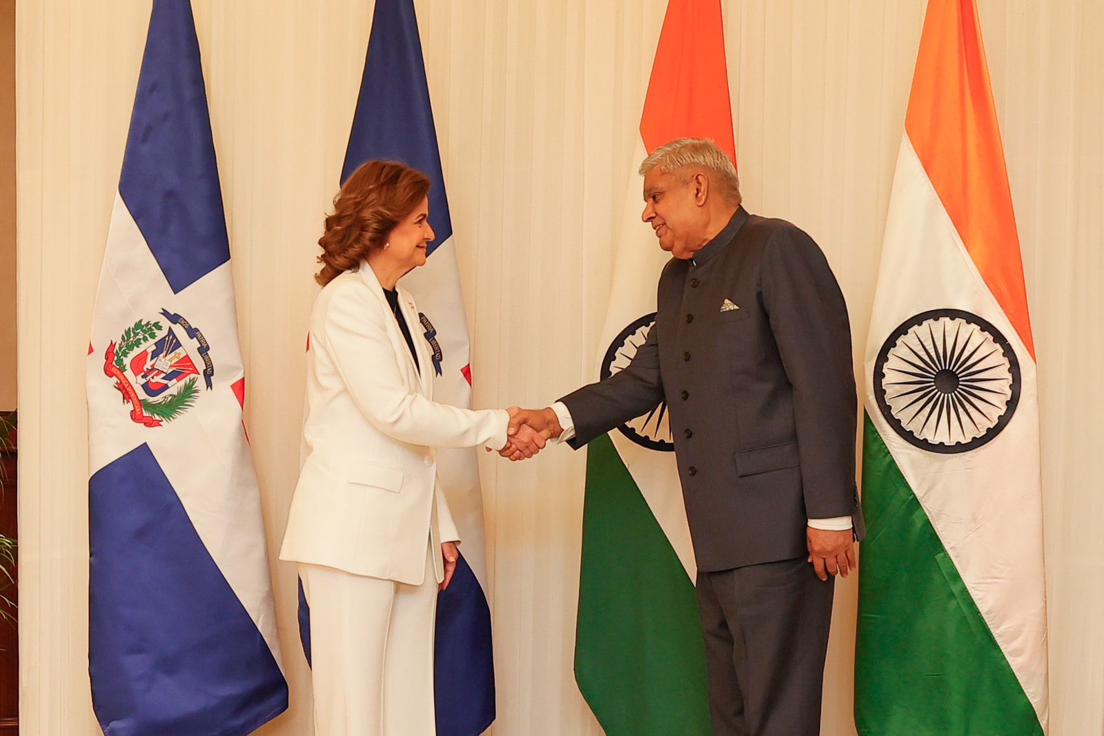 El vicepresidente de la República de India, S.E. Shri Jagdeep Dhankhar, y la Vicepresidenta de la República Dominicana, S.E. Sra. Raquel Peña Rodríguez, se reunieron en Nueva Delhi, India, el 4 de octubre de 2023, marcando un diálogo político de alto nivel entre los dos países, y mantuvieron discusiones productivas sobre asuntos bilaterales, regionales y multilaterales de interés mutuo. Esta visita es muy significativa ya que tiene lugar al tiempo en que la relación entra en el 25º año desde el establecimiento de relaciones diplomáticas el 4 de mayo de 1999.