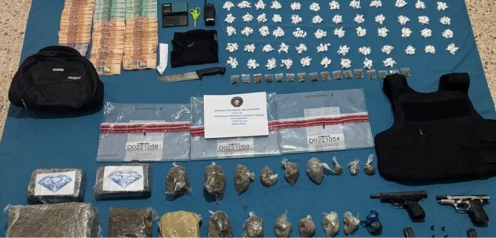 En medio del enfrentamiento, las unidades actuantes, lograron capturar al presunto delincuente, a quien se le ocupó una mochila con varias porciones presumiblemente de cocaína, con un peso aproximado a los 2, 960 gramos, así como otros 235 de un vegetal que se presume es marihuana, una balanza, una radio de comunicación, una tijera, un cuchillo y un pasamontañas.