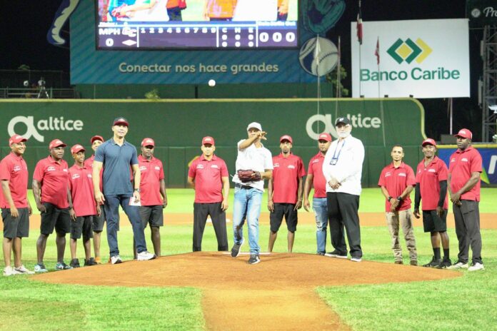 Jeudy Paula Capellán, encargado del terreno, lanzó la primera bola junto a sus ayudantes Oscar Gutiérrez, Concepcion Rosario, Joscar Pineda, Juan Paulino, Marino Parra, Francisco Núñez, Edwin Lara, Jonathan Vera, Daniel Feliciano, José Hernández y Yon Rosario.