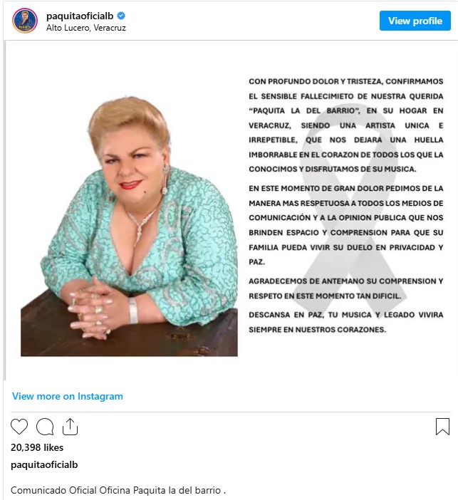 A través de sus redes sociales se dio a conocer su partida: “ Con profundo dolor y tristeza, confirmamos el sensible fallecimiento de nuestra querida Paquita la del Barrio, en su hogar en Veracruz, siendo una artista única e irrepetible, que nos dejará una huella imborrable en el corazón de todos los que la conocimos y disfrutamos de su música.