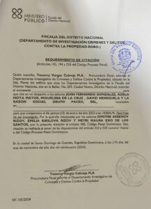 En el marco de las investigaciones en curso relacionadas a varias denuncias por estafa inmobiliaria contra la empresa Grupo Paceo, fueron citados Joan González; Adela Mota; Miguelina de la Cruz y David gregorio Negueruela, para ser interrogados por ante el Departamento de Investigación de Crímenes y Delitos contra la Propiedad – Robo, de la Fiscalía del Distrito Nacional.