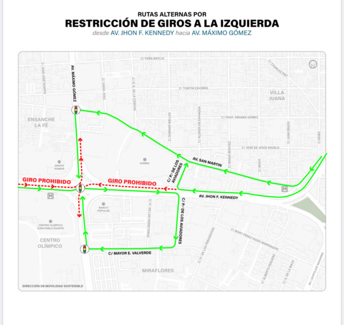Para el giro restringido en la John F. Kennedy hacia el sur por la Máximo Gómez, los conductores podrán tomar la avenida San Martín y girar a la izquierda en la avenida Máximo Gómez, o bien utilizar la calle Paseo de los Aviadores para incorporarse a la San Martín y desde allí conectar con Máximo Gómez hacia el sur.