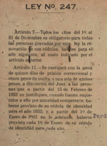 La ley que dio origen a la cédula fue la núm. 247, aprobada el 29 de diciembre de 1931 y publicada en la Gaceta Oficial núm. 4424, según refiere el Archivo General de la Nación en su portal web. Aunque su objetivo público era dotar a los ciudadanos de un documento oficial de identificación, los historiadores de la época coinciden en que, de manera subyacente, respondía al propósito de control político de la población.