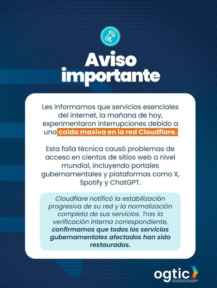Luego de que Cloudflare comunicara el restablecimiento progresivo de su red y la normalización de sus servicios, la OGTIC realizó las verificaciones internas correspondientes, confirmando la restauración completa de los servicios digitales gubernamentales afectados, así como la operación normal de todas las plataformas, sin degradación en el rendimiento.